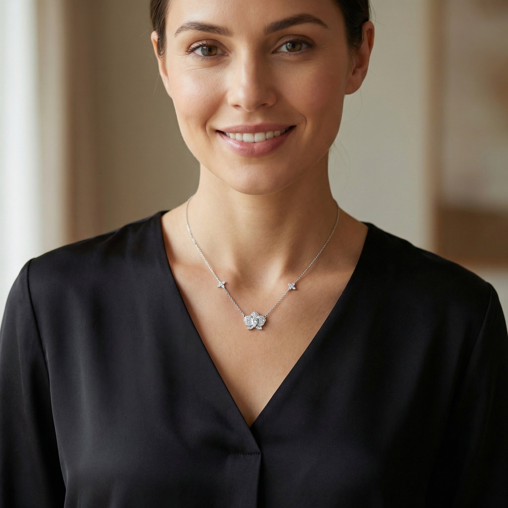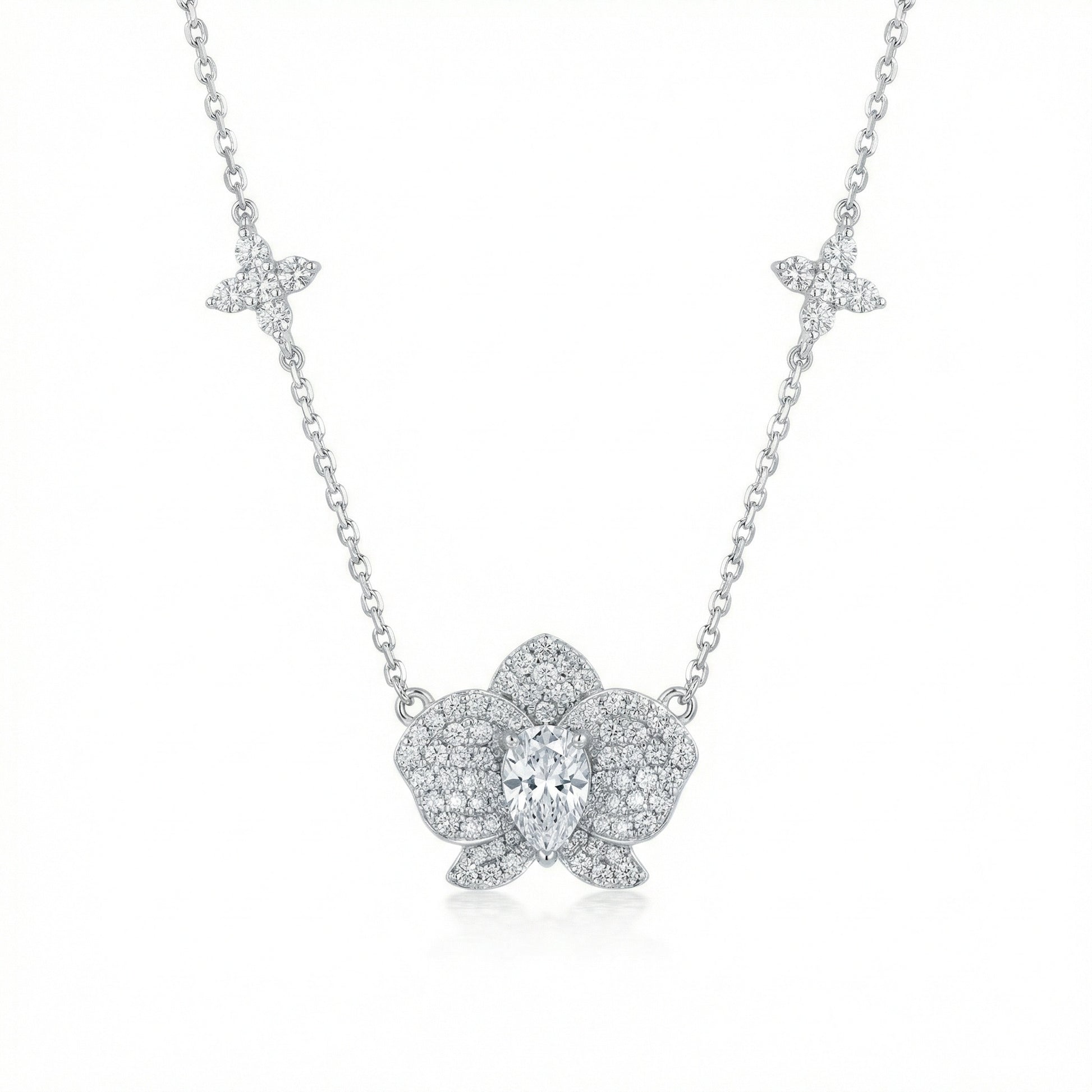 This exquisite necklace features a breathtaking orchid-inspired pendant as its centerpiece, meticulously crafted in a lustrous silver-tone finish. At the heart of the floral design is a brilliant pear-cut gemstone, surrounded by intricately layered petals encrusted with pavé-set diamonds that capture and reflect light from every angle. The delicate link chain is further accented with two matching clover-shaped motifs, providing a balanced and symmetrical aesthetic. Combining the ethereal beauty of a blooming orchid with sophisticated craftsmanship, this piece serves as a timeless symbol of elegance and grace. Whether worn for a formal gala or to elevate a sophisticated daily ensemble, its radiant design and nature-inspired charm make it a standout addition to any fine jewelry collection.