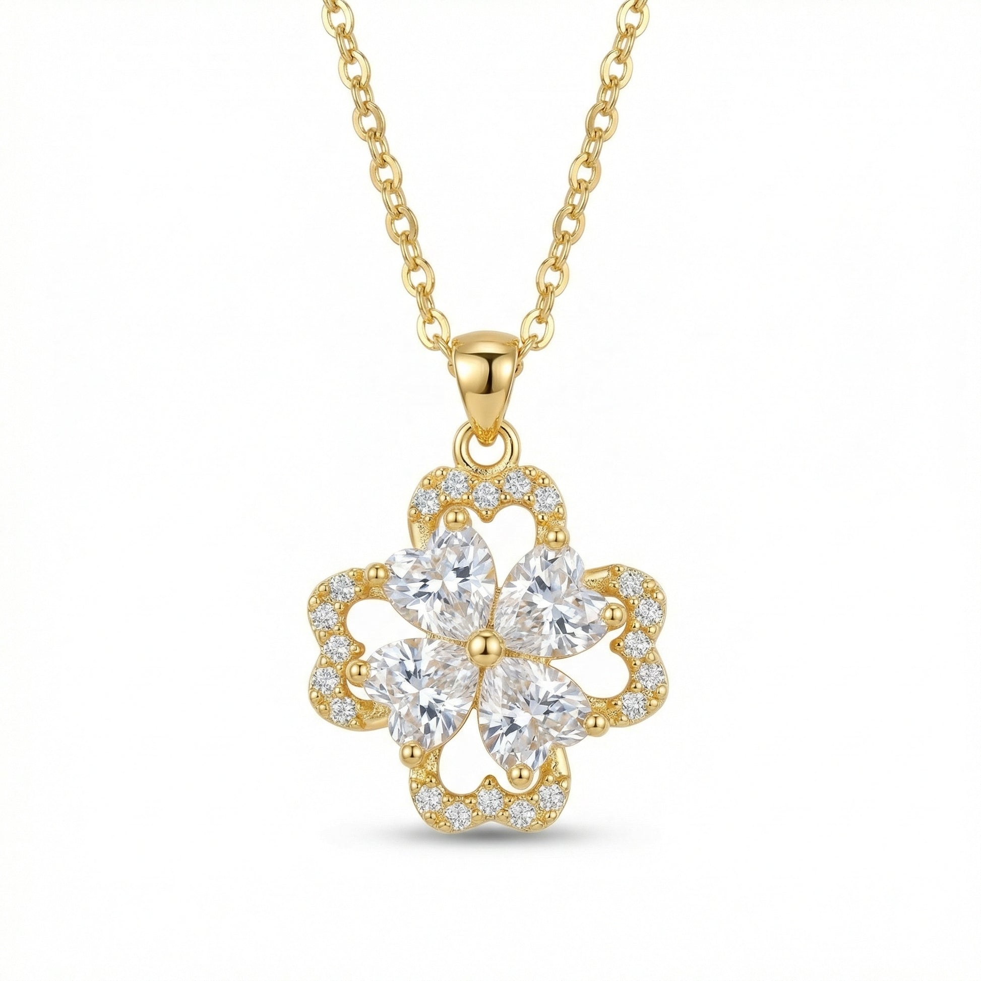 This exquisite pendant necklace captures the essence of luck and love with its stunning four-leaf clover design. At the center, four brilliant heart-shaped crystals come together to form a floral motif, radiating light from every angle. Each petal is further enhanced by a delicate border of shimmering round-cut stones, creating a layered and luxurious look. Suspended from a classic link chain, this piece features a lustrous metallic finish that adds a touch of warmth to any outfit. Perfect for daily wear or special occasions, this charm-inspired jewelry makes a thoughtful gift for someone special. Its timeless appeal and intricate craftsmanship ensure it remains a cherished addition to any collection. Whether worn alone or layered, this piece brings a sophisticated sparkle to your ensemble, making it an ideal choice for those who appreciate fine details and classic elegance.
