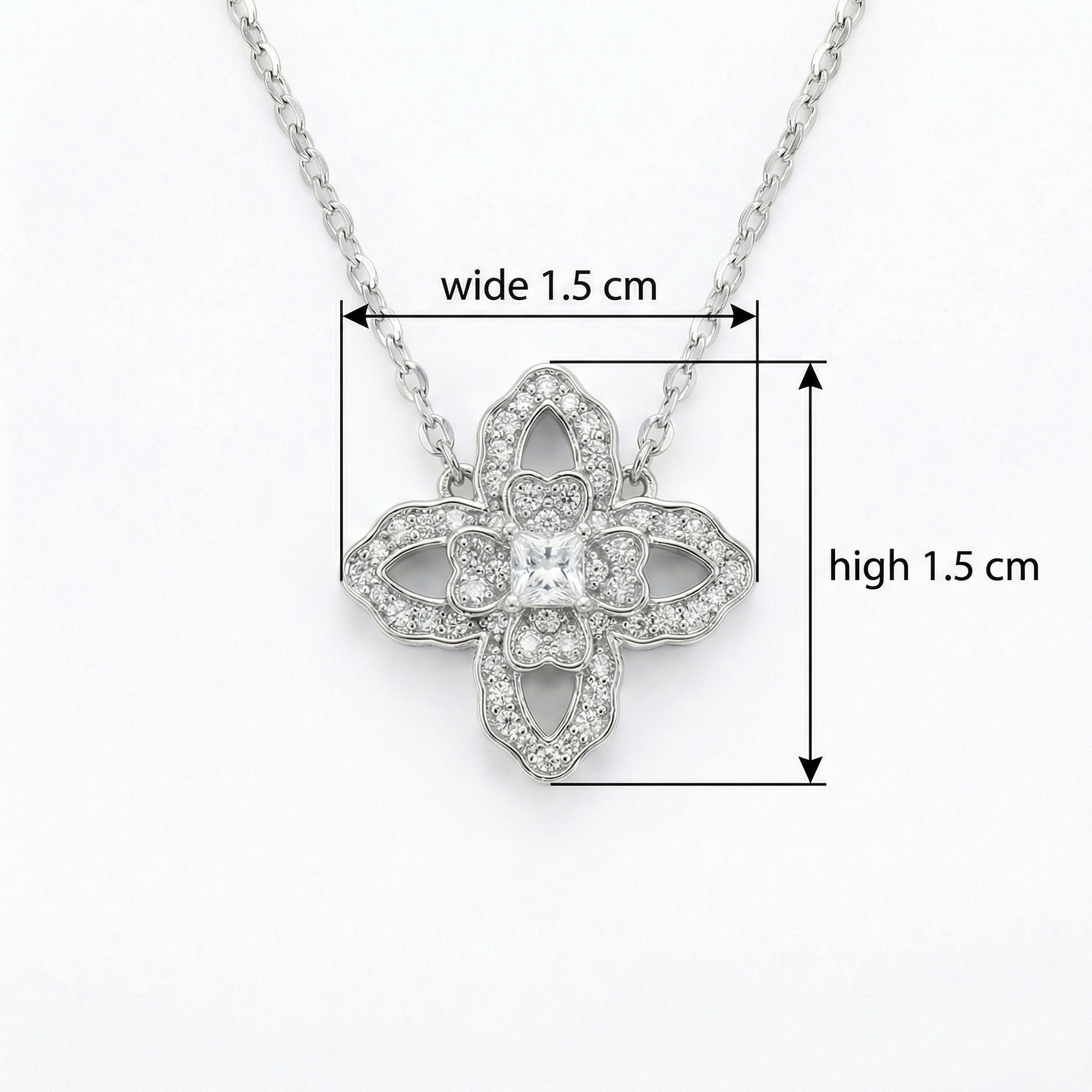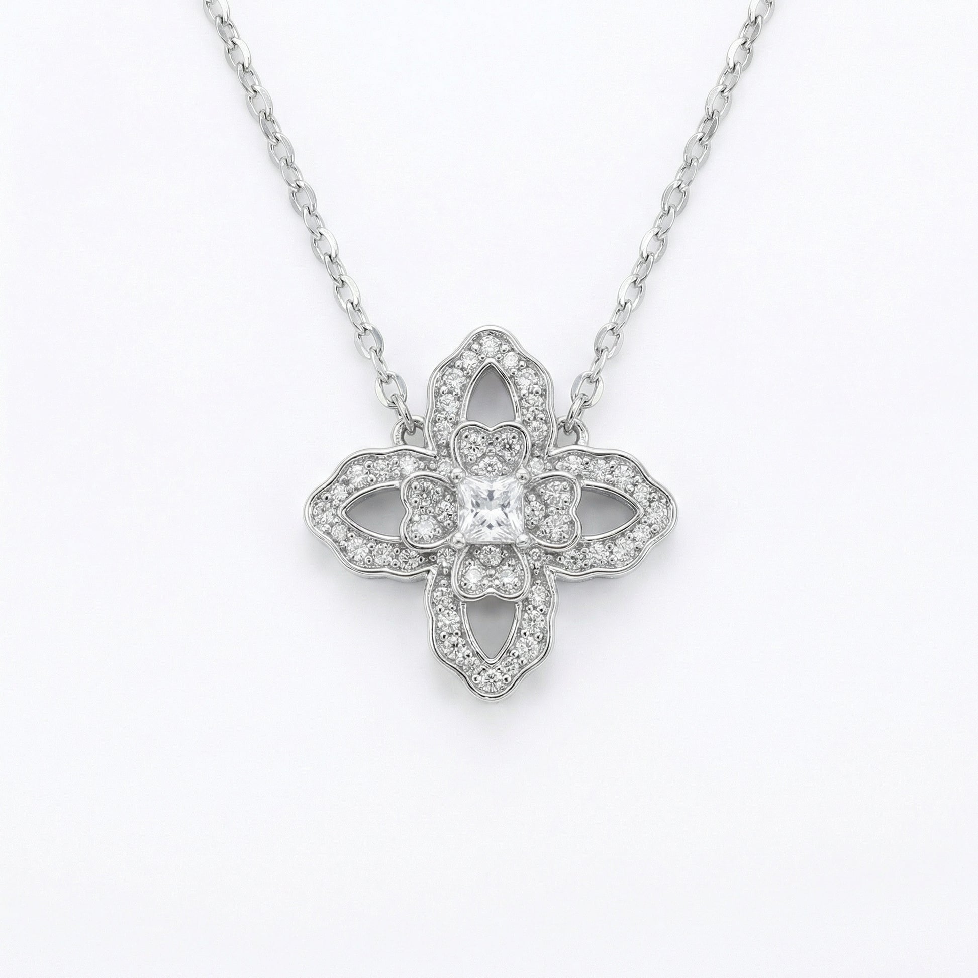 This stunning necklace features a sophisticated four-leaf clover pendant crafted in high-quality silver-toned metal. At its heart lies a brilliant square-cut clear stone, serving as a focal point for the intricate design. Each petal is meticulously adorned with shimmering round-cut pavé stones, creating a dazzling effect from every angle. The delicate open-work filigree adds a touch of vintage elegance and airy grace. Suspended from a classic silver cable chain, this piece offers a timeless appeal that complements both casual and formal attire. Whether as a symbol of good luck or a statement of refined style, this exquisite pendant is a perfect accessory for any jewelry collection or a thoughtful gift for a loved one.