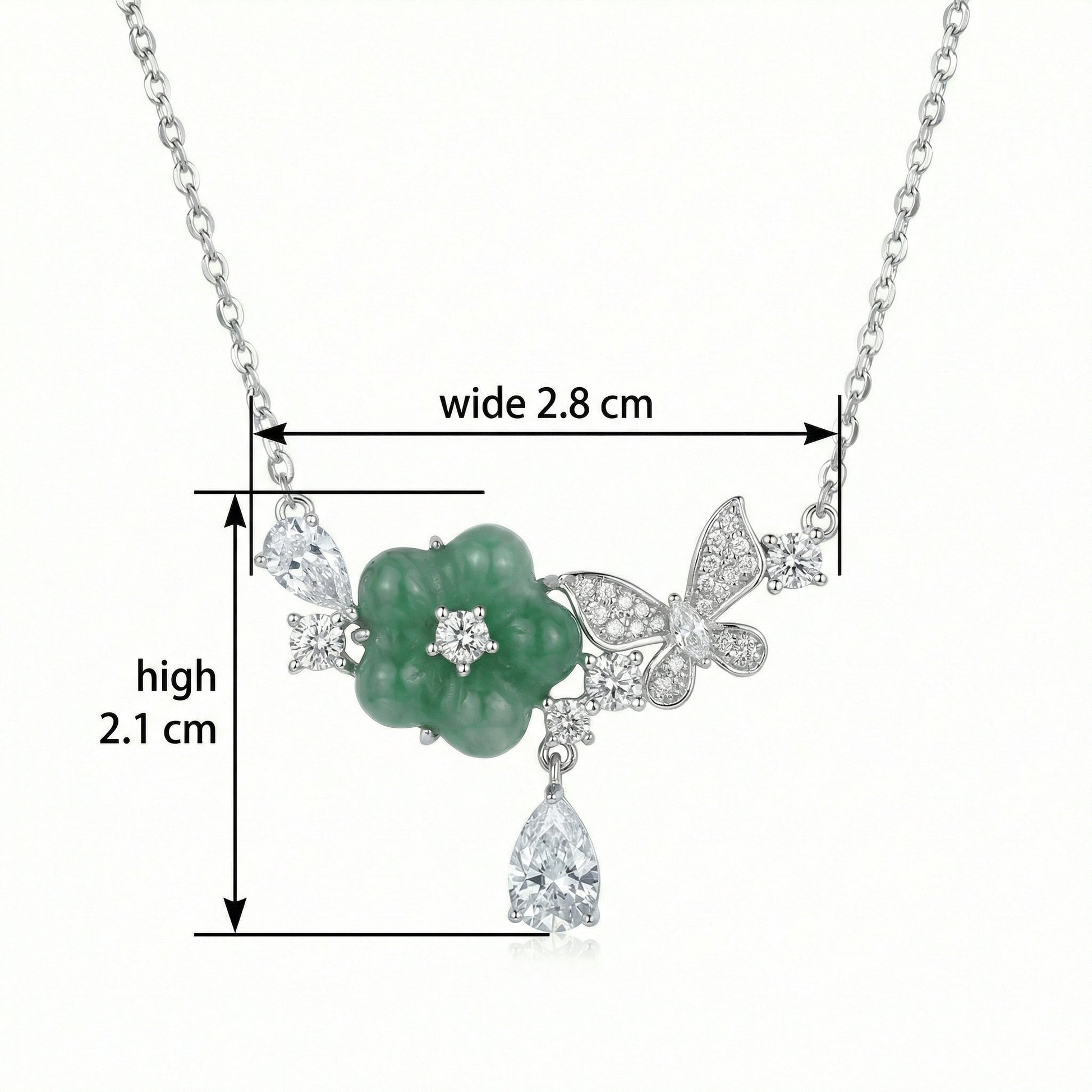 925 Sterling Silver Elegant Silver Necklace Featuring Green Jade Flower and Diamond Butterfly Accents