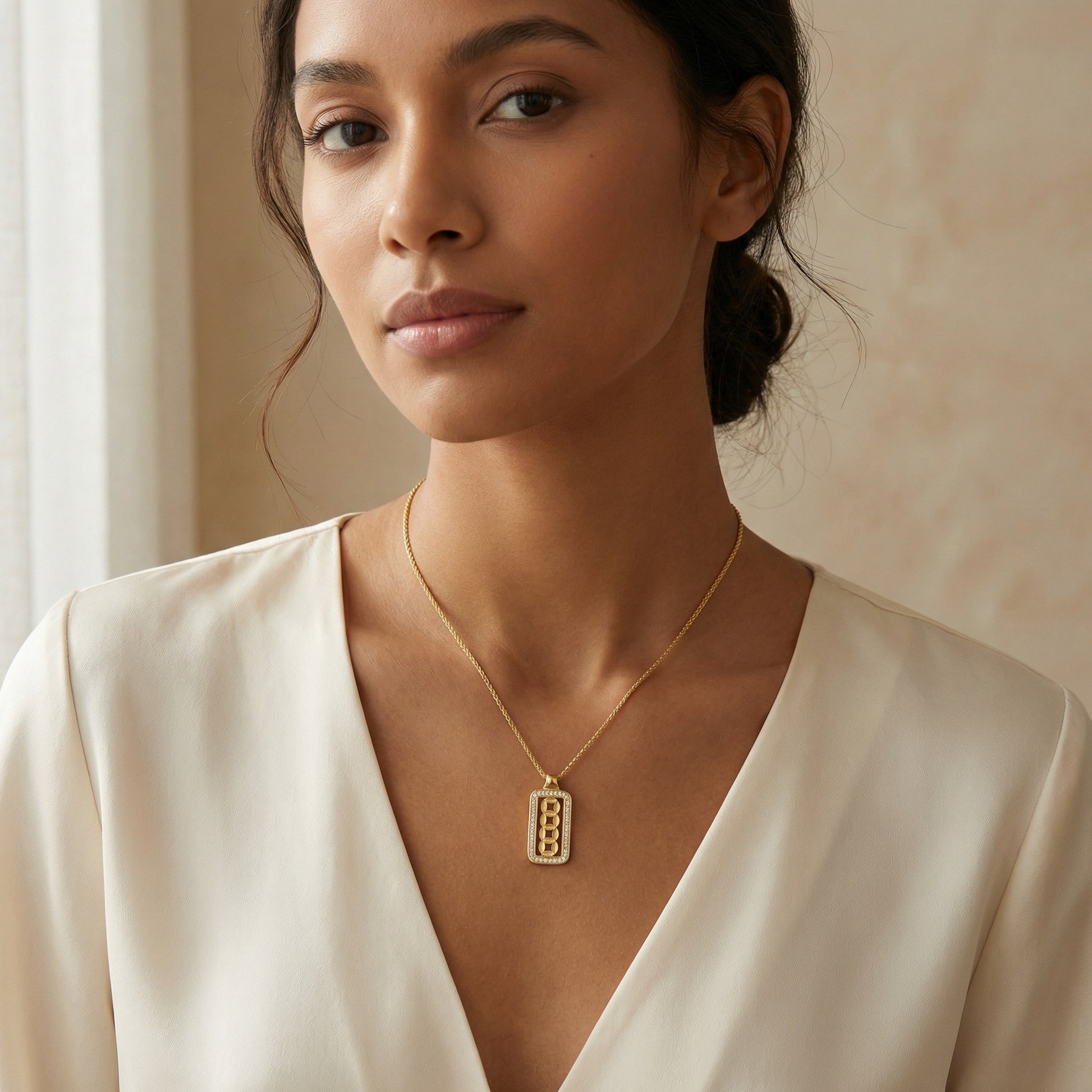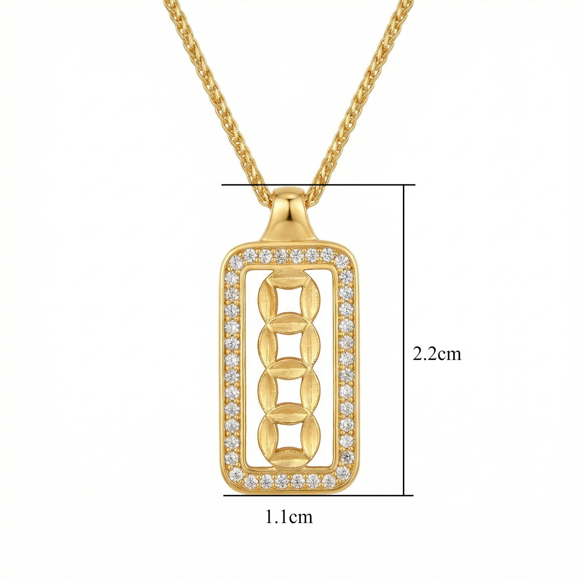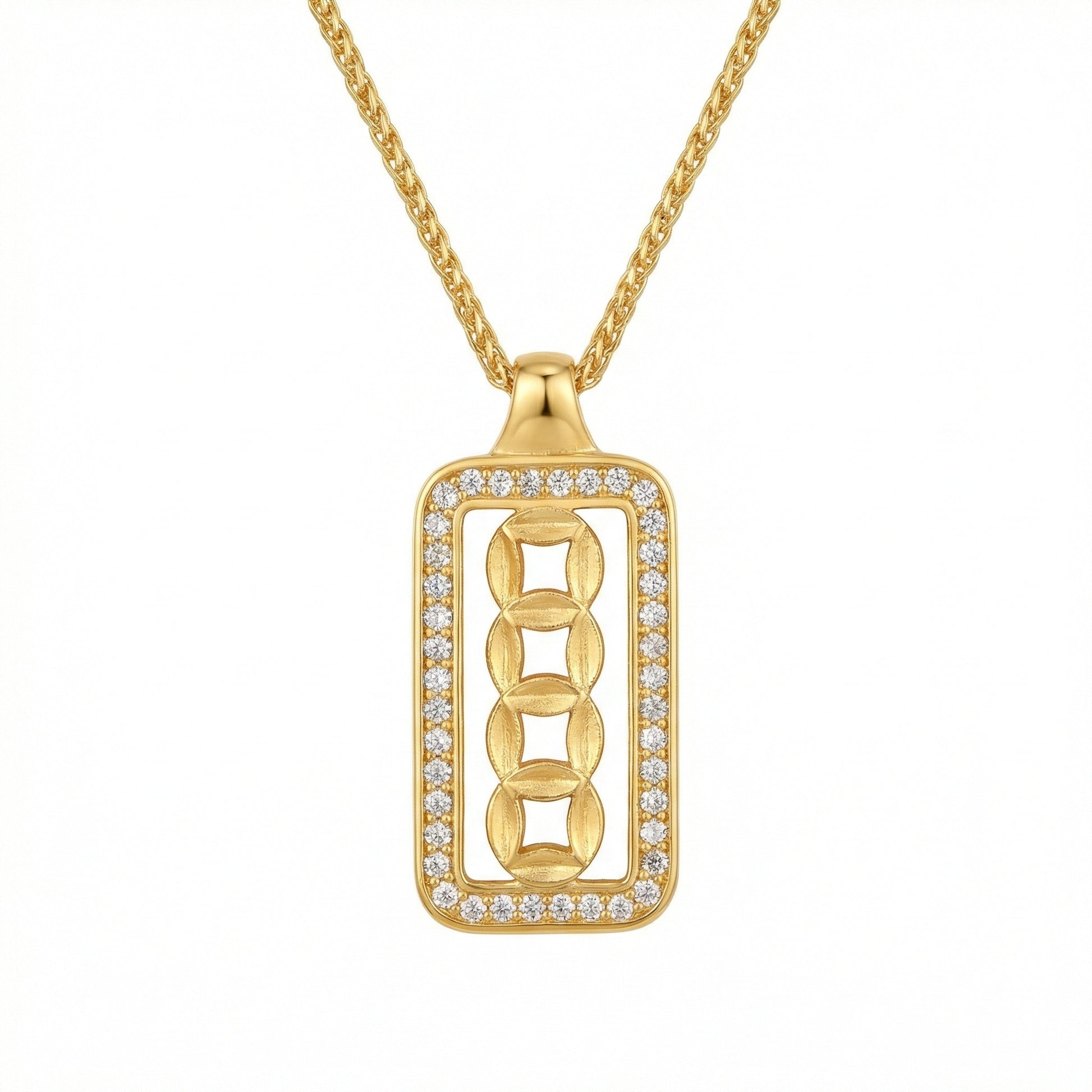 This exquisite necklace features a beautifully crafted rectangular pendant with a distinctive central motif. At its heart, four interlocking circular shapes reminiscent of traditional coins create a vertical pattern of unity and prosperity. The frame of the pendant is meticulously set with a border of brilliant round-cut clear stones that catch the light from every angle, adding a touch of sophisticated glamour. The piece is finished in a warm, polished metallic hue that radiates luxury. Suspended from a delicate yet sturdy wheat-style chain, this accessory is perfect for adding an elegant statement to both casual and formal ensembles. Its unique blend of classic symbolism and contemporary design makes it a versatile addition to any jewelry collection, offering a timeless aesthetic that celebrates refined craftsmanship and intricate detailing.
